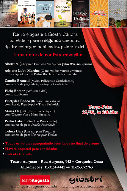 "Este é um Evento promovido pela Giostri Editora 1 vez a cada 2 meses visando incentivar e estimular a leitura de peças dramatúrgicas e a formação de público de TEATRO. Livros são ótimos, Teatro também, então imagina a união dos dois?! Teatro em livro!!! Vale a pena, né?"